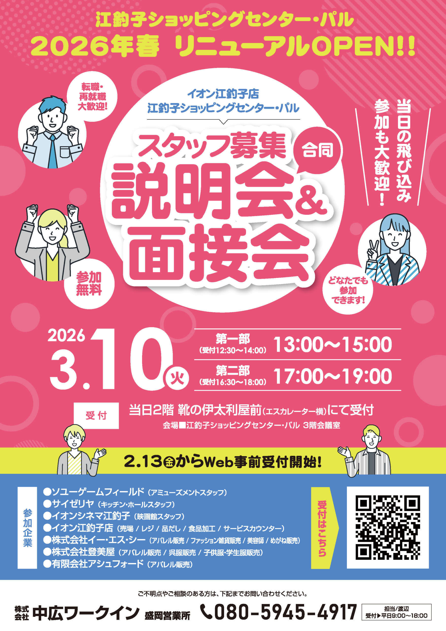 - 【イオン江釣子店&江釣子SCパル】スタッフ募集合同説明会&面接会開催のご案内