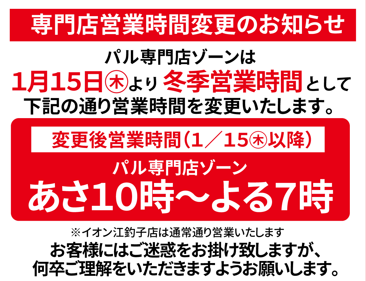 誠に勝手ではございますが、令和8年1月15日(木)より、「冬季営業時間」として専門店ゾーンの営業時間を変更させていただきます。
