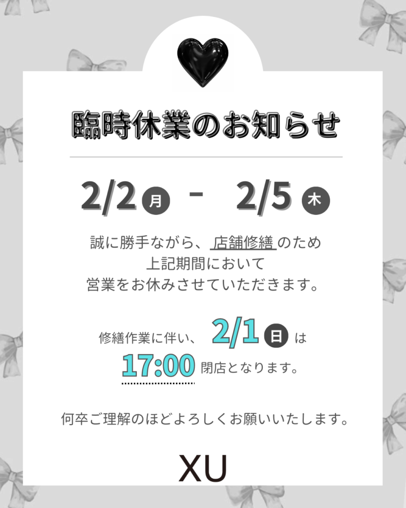 店舗修繕のため臨時休業2/6(金)より通常営業いたします