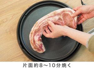 裏返して8~10分で焼き上がりです。裏返し時に野菜も一緒に焼くと、溶け出した豚の脂で焼き野菜も美味しく仕上がります。