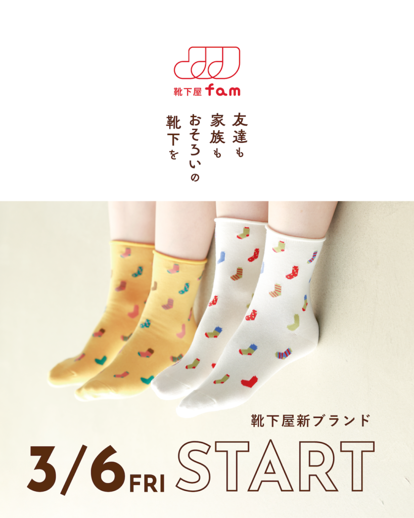 - \はじめましてfamです/3月6日(金)靴下屋から新ブランドが誕生します。その名も「靴下屋fam」。「友達も家族もおそろいの靴下を」をコンセプトにみんなで楽しめる豊富なデザインをお届けします。1足550円/期間限定で3足1485円で販売します。お気に入りの靴下を見つけに靴下屋へ🧦✨※取り扱いのない店舗も一部ございます。#靴下屋から新ブランド#はじめまして靴下屋fam#友達も家族もお揃いの靴下を