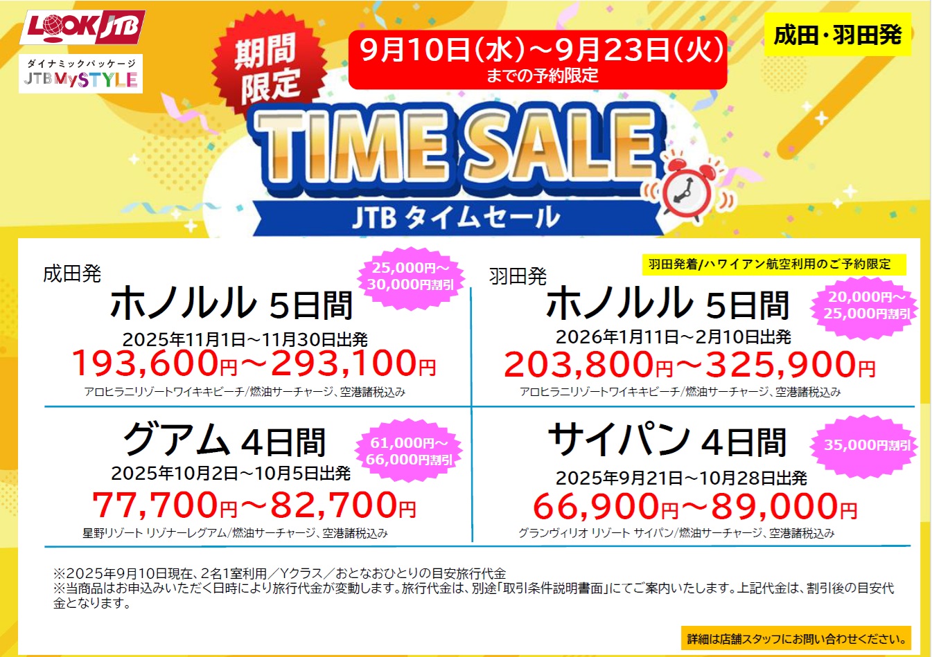 🏃♂️🏃♂️🏃♂️JTBタイムセール 9月10日よりスタート!🏃🏃🏃