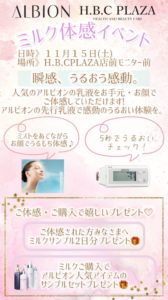 《場所》H.B.C PLAZA店前モニター前ふっくら♡もっちり肌に導くアルビオンの乳液をお手元・お顔でご体感いただけます!